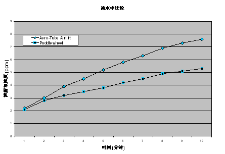 以Aero-Tube™的增氧管式增氧机和市场上最流行的l两种水车式增氧机分别在淡水和海水中做增氧效率的对比试验。