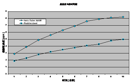 Aero-Tube™ 增氧系统的高效率可以从下表随着时间和盐度变化的溶氧曲线图清楚的反映出来,